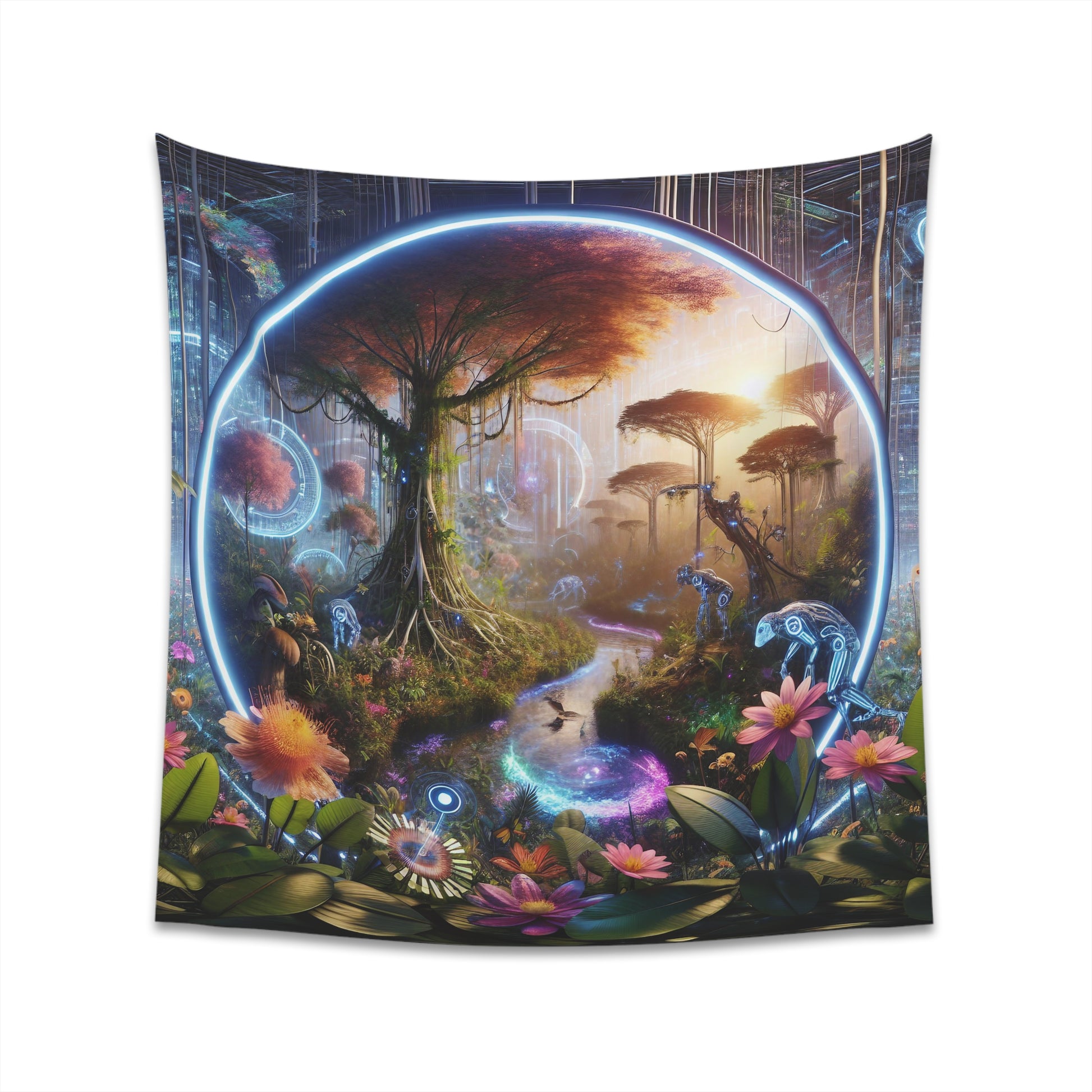 Immerse yourself in a world where biology meets technology with our 57x57 inch tapestry. This piece showcases an AI-inspired jungle, blending organic and synthetic elements seamlessly. A perfect addition for any future-focused decor. #AIJungle #BioMechanicalArt #WallTapestry #UniqueHomeDecor #OrganicSynthetic #ArtLovers #AIInArt #TechnoNature #FusionFloraFauna #JungleTapestry.